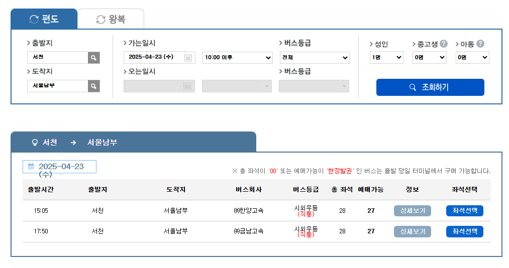 - 출발지: 서천 / 도착지 선택