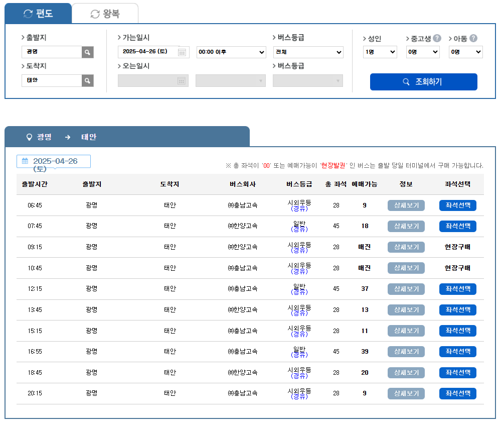 - 출발지, 도착지, 출발일을 입력하여 버스 시간을 조회합니다.